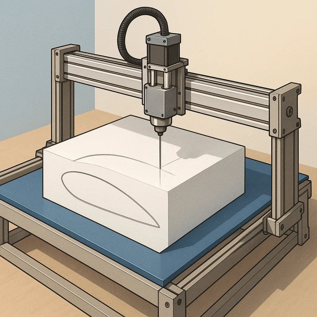 Generating toolpaths for airfoils and wing cores is the part that turned this into a CNC project rather than a jig. I downloaded airfoil coordinate .dat files and wrote a small script to interpolate sections along the span to produce vertical slices, then exported those slices as linear G-code suitable for a GRBL controller. The workflow is: pick an airfoil, define span and chord distribution, slice into sections, generate G-code for each slice, and feed the code to the machine while stacking foam sheets on the bed. The stack-up method gives precise wing cores with consistent internal shear web positions and allows composite skins to be fitted later.