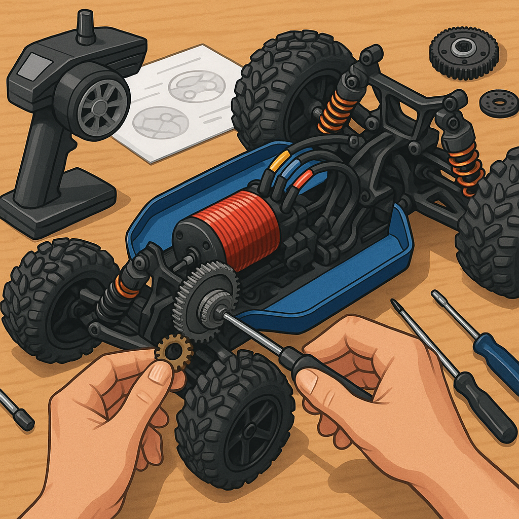 Gearing is a frequent source of failures and hazards, so check gear mesh, pinion and spur condition, and correct ratio for the terrain before every run to avoid stripped teeth and sudden lock-ups that can fling a car unexpectedly.
