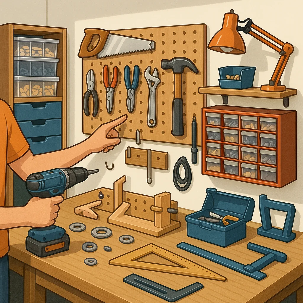 Use a mix of vertical and modular storage to keep tools accessible, with pegboards for frequently used hand tools, stackable clear bins for small parts and labelled drawers for consumables like screws and connectors, and for inspiration on layouts and kit lists visit WatDaFeck to see real hobbyist setups.